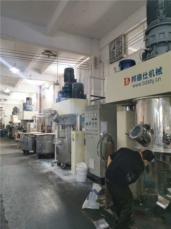 行星攪拌機是一種新型高效無死點混合攪拌設備,它具有獨特、新穎的攪拌形式,釜內有兩根或三根多層漿葉攪拌器和一至兩個自動刮刀,攪拌器在繞釜體軸線公轉的同時,又以不同的轉速繞自身軸線高速自轉,使物料在釜體內作復雜的運動,受到強烈的剪切和搓合。此外設備內的刮壁刀繞釜體軸線轉動,將粘在壁上之物料刮下參于混合,使其效果更為理想。釜體采用特殊密封結構,可進行加壓及抽真空攪拌,具有良好的排氣除泡效果。漿體夾套可根據用戶需要進行加熱、冷卻。設備密封性良好。出料方式為壓料式,設備釜蓋可液壓升降,釜體可自由移動,操作十分方便。而且攪拌漿及刮刀可隨橫梁上升而完全脫離釜體,便于清洗。